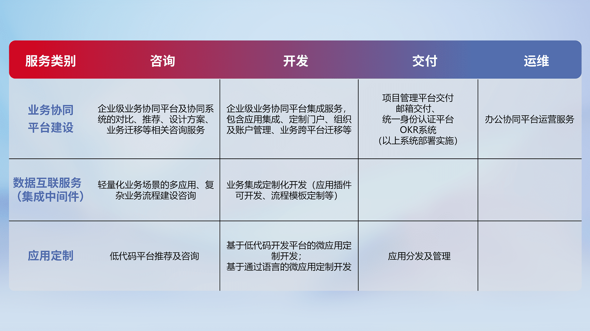 针对钉钉、、、企微、、、IDaas等平台级产品提供产品的规划、、、、方案、、、、交付、、、定制化开发等服务,,,实现如统一协同办公、、智能客户服务、、、、混合会议管理、、智能数据查询、、、、等业务场景,,实现数字化转型。。。。